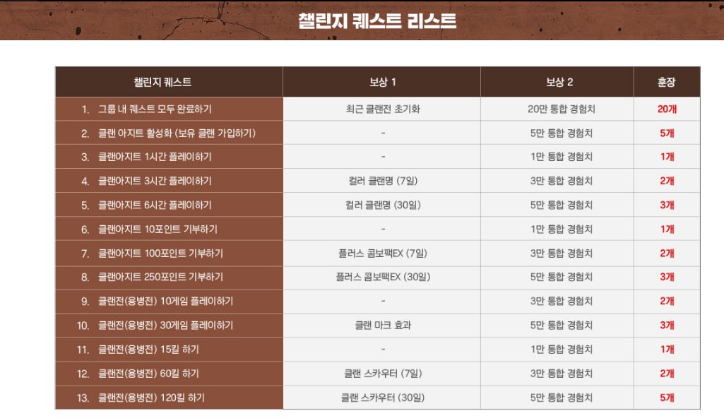 클랜전(용병전) 일정 킬과 동시에 플레이하고 클랜 아지트 1시간~6시간 플레이하기 및 10~250포인트 기부와