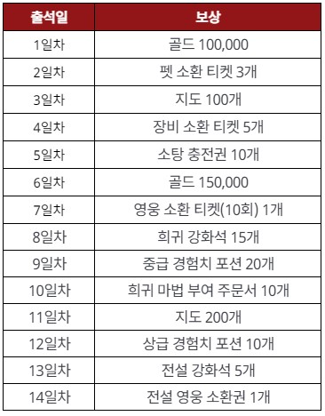14일간 꾸준히 접속만 해도 전설 영웅 소환권 1개를 획득하고 이 외에도
