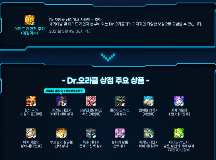 이 포인트로 각종 보상을 교환할 수 있고 아라드레인저 훈련하면 할수록 등급이 올라가며