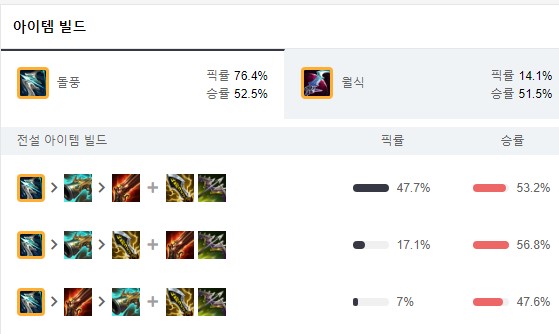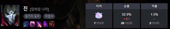 티어/승률/픽률 모두 상위권에 속하면서 승률만 약간 비교적 낮은 정도이나