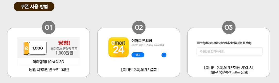 이마트24 편의점 어플을 설치하신 후, 접속하셔서 그 당첨 추천인 코드를 입력하시면
