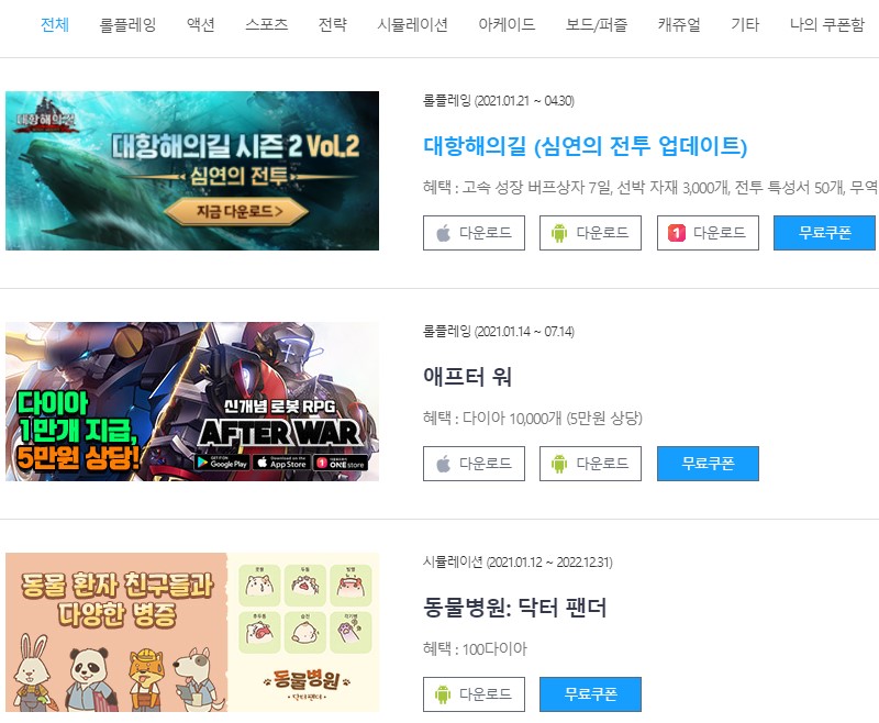 그리고 사이트 내에 있는 여러가지 장르의 게임무료쿠폰까지 나눠드리고 있습니다.