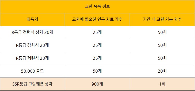 최고 보상인 SSR그랑웨폰은 연구 자료 개수를 900개 필요로 하고