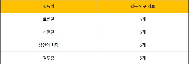 그랑사가에서 배틀모드로 각 획득처에 따른 연구자료 갯수 입니다