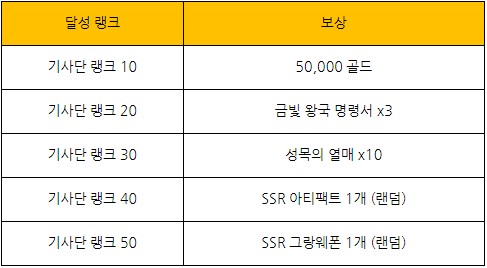 기사단 랭크를 각각 10/20/30/40/50 달성하면