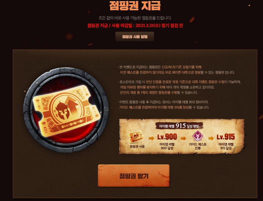 점핑권 지급및 사용 마감일은 2021년 3월 31일(수) 점검 전까지니