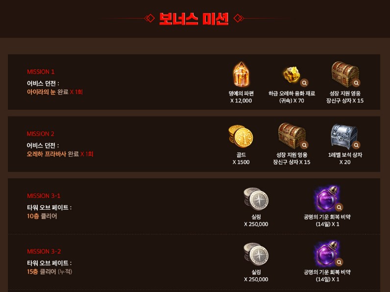 각 미션에 따라 클리어하시게 되면 각종 기능성아이템,재화,골드