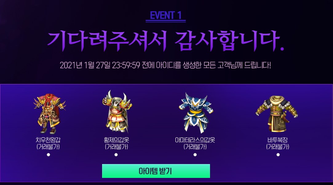 일단 2021년 1월 27일 23시 59분 이전에 아이디를 생성한 모든 유저분들한테 드리는 아이템 입니다.