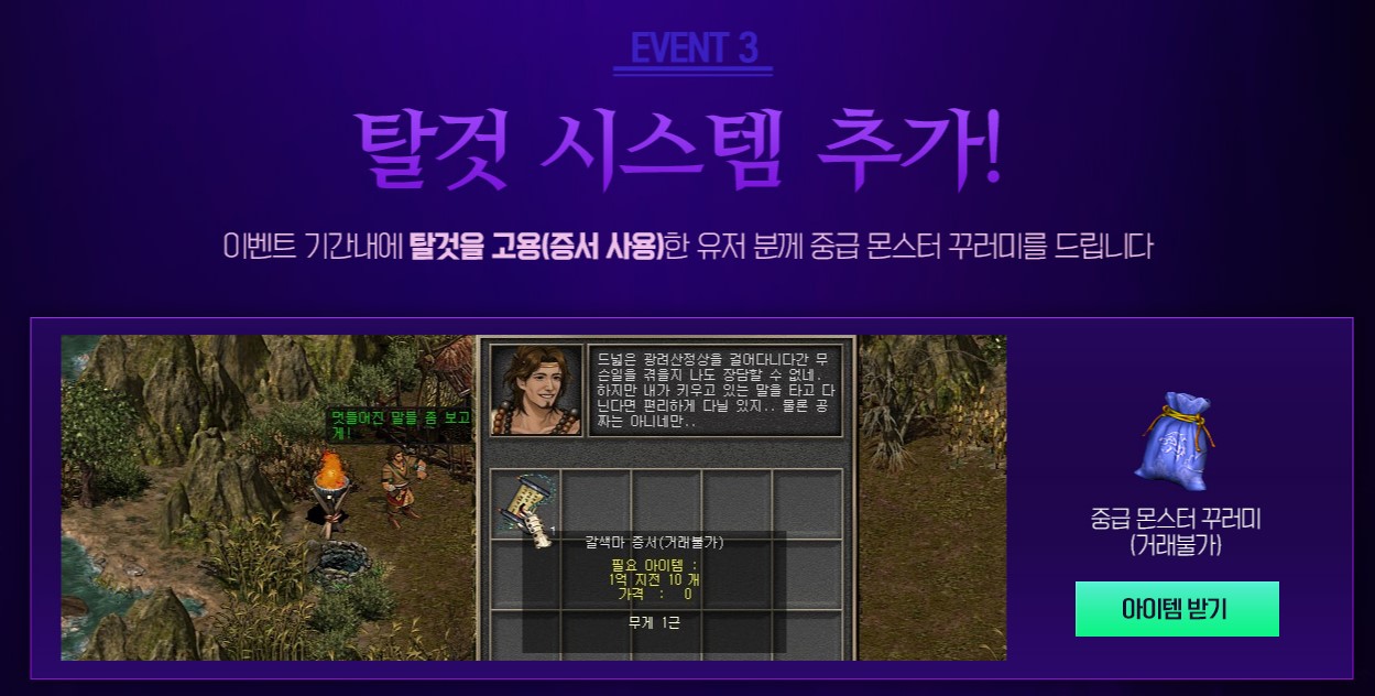 그리고 이벤트 기간에 탈것을 고용(10억지전)한 유저분들에게 '중급 몬스터 꾸러미'를 드리는데요.