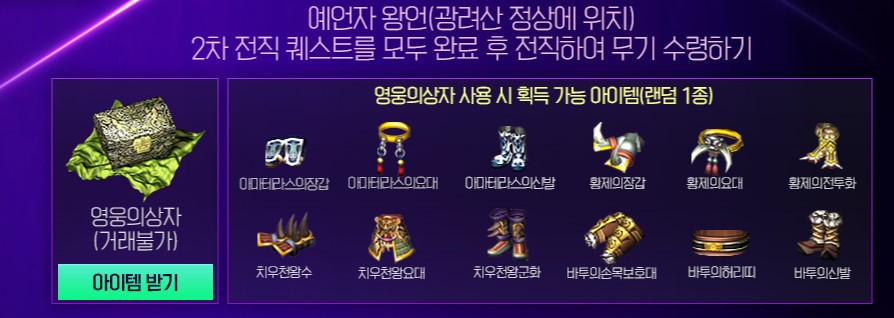 '영웅의 상자'를 얻게 되는데 여기서 각 아마테라스,황제,바투,치우천왕의 장비중