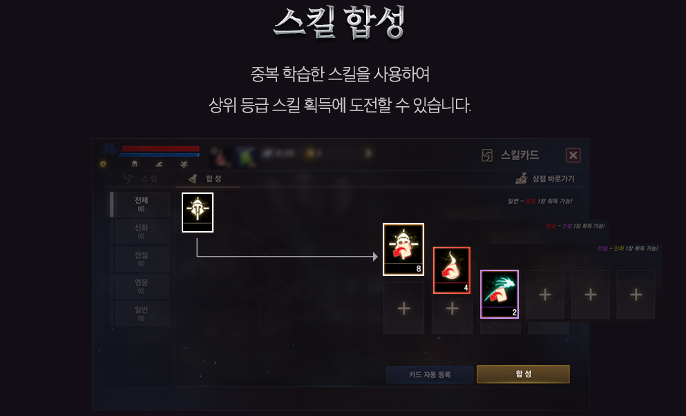 변신/마법인형 카드와 동일하게 추가로 습득한 스킬 카드 합성을 통해 상위등급의 스킬을 획득할 수 있게 됩니다.