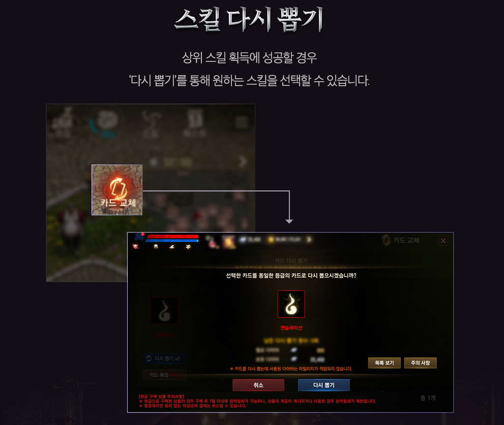 상위 스킬 획득에 성공할 경우 '다시 뽑기'를 통해 원하는 스킬을 선택할 수 있습니다.