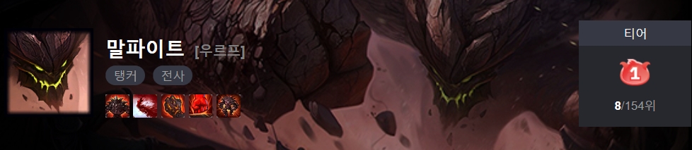 우르프 말파이트는 현재 154개 챔피언 중에서 8위입니다. 말파이트보다 상위에 있는 챔피언들은