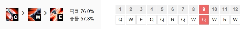 스킬은 Q W E 순서대로 찍어줍시다. E는 CC용으로 1만 찍어주고 Q에 몰빵해