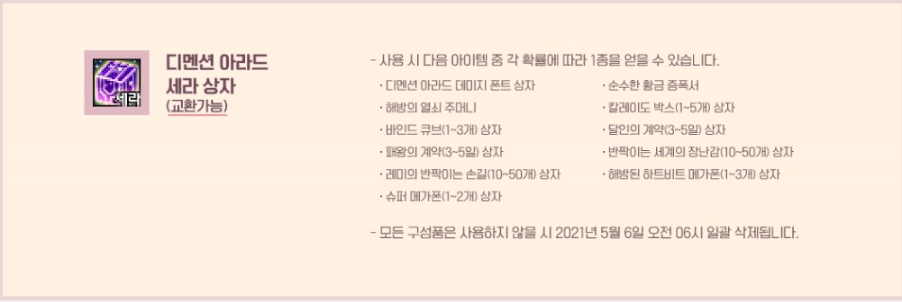 교환 가능한 아이템으로 사용하지 않을 시 5월 6일 06시 일괄 삭제됩니다.