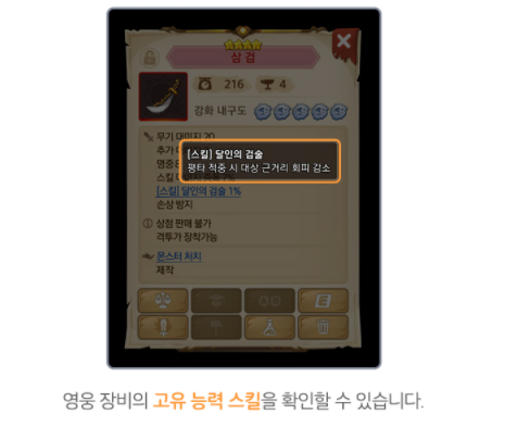 영웅 장비의 고유 능력 스킬을 확인할 수 있어요.