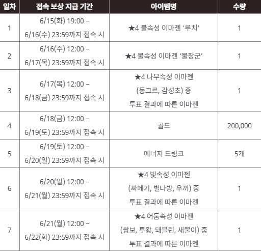 *가장 많이 득표한 속성별 이마젠이 각 일차에 해당하는 접속 보상 지급 기간 내 1회 지급