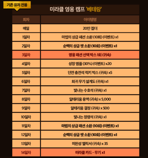 이벤트 기간 게임에 접속하면 영웅 패션 선택 박스(3일차), 미라클 카드-무기(14일차) 등등