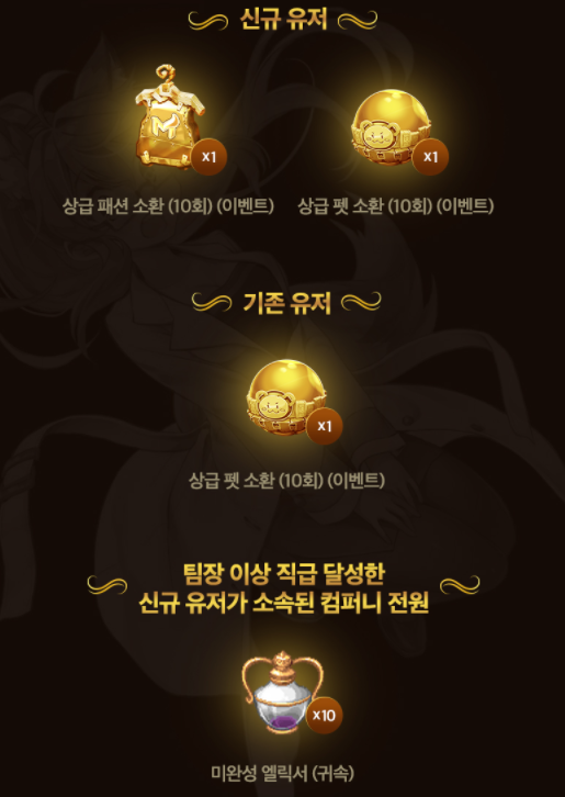 신규 모험가가 컴퍼니 가입 후 팀장 직급 이상을 달성하면 컴퍼니원에게 선물을 준다고합니다.