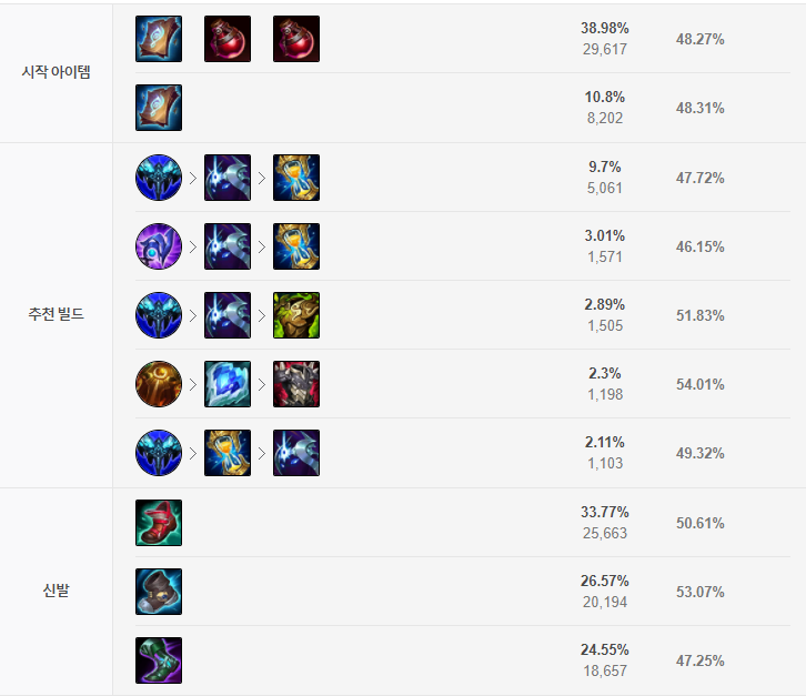 만년서리는 블리츠 크랭크에게 좋은 아이템이고 CC범위를 추가해주기 때문에 필수적으로 가야합니다. 그 다음 Q스킬의 쿨감을 위해 쿨감 템을 가주시면 좋고 신발은 아이오니아 장화를 고정으로 생각하시면 됩니다.