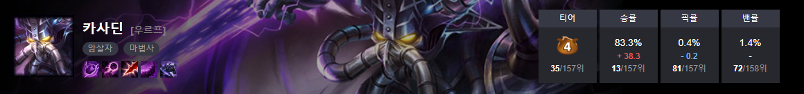 우르프 카사딘은 157개 챔피언중 35위고 현재 4 티어에 자리잡고 있습니다.