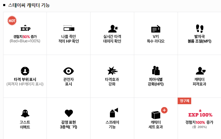 감정 표현 3종씩 / 스프레이 기능 / 캐릭터 세트 효과 / 경험치 100% 증가 (총 200%)