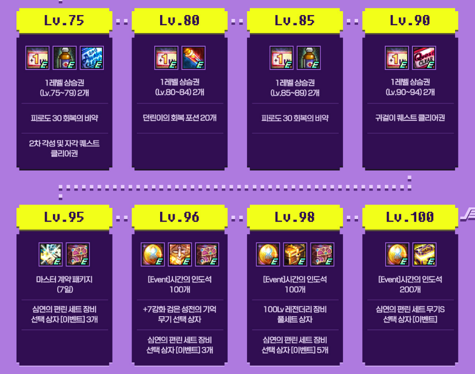 98레벨 달성: [Event] 시간의 인도석 100개, 100Lv 레전더리 장비 풀세트 상자,