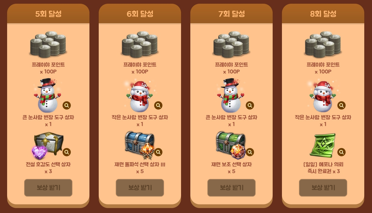 4회 달성 : 프레이야 포인트 100포인트, 작은 눈사람 변장 도구 상자, 재련 파편 선택 상자 5개