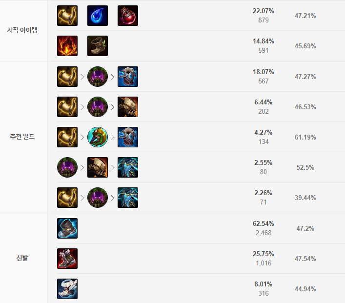 초반에는 버티는데 주력하다 코어템을 하나씩 갖추면서 강해지는 타입입니다.