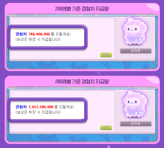 * 260레벨 이상부터는 260레벨에서 획득 가능한 경험치와 동일한 양의 경험치를 획득합니다.