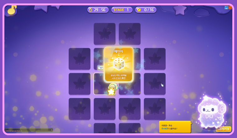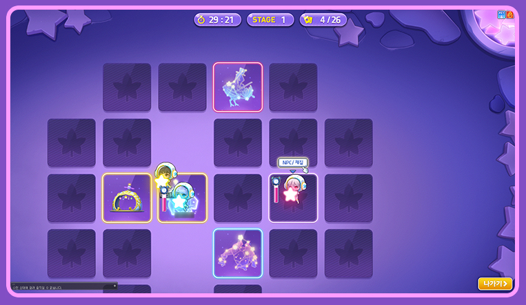 2초간 카드 확인이 진행됩니다. 동일한 그림의 카드로 확인될 경우 해당 카드는 스테이지에서 사라집니다.