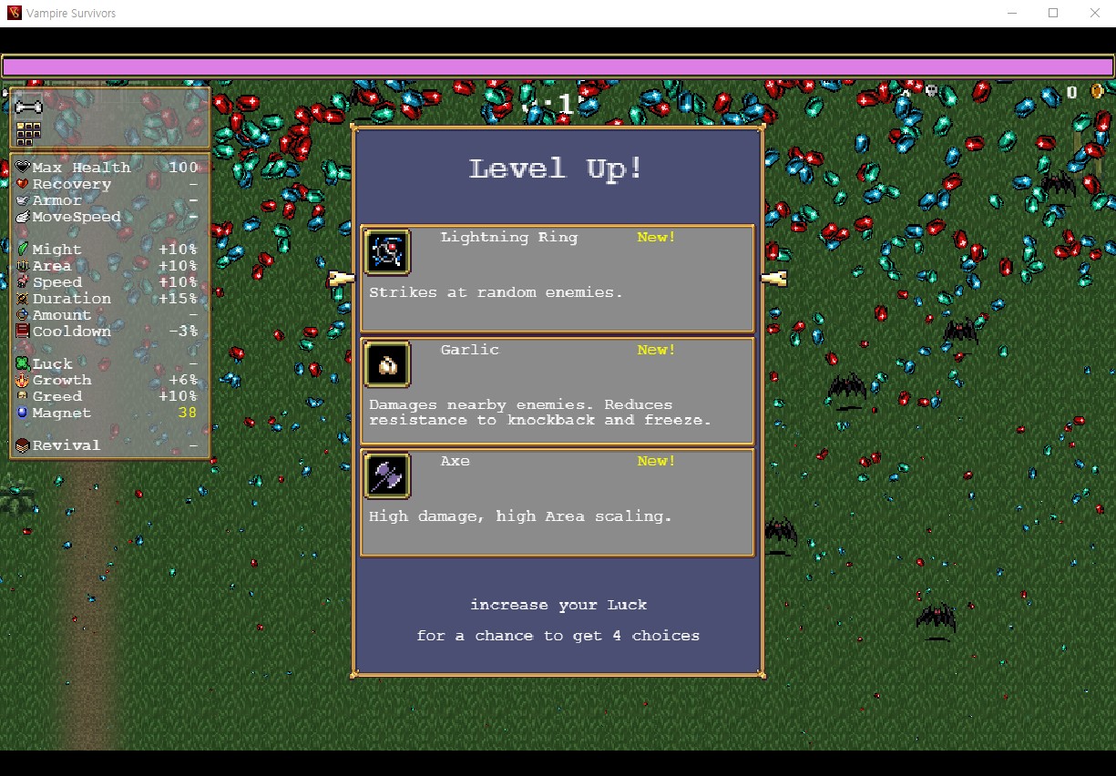 레벨을 높이면 세 가지의 아이템들 중에서 하나를 선택해서 새로운 무기를 획득하거나 기존 무기 레벨을 올릴 수 있고