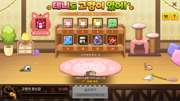 귀여운 고양이와 놀아주고 다양한 보상을 받을 수 있는 테니도 고양이 있어 이벤트와
