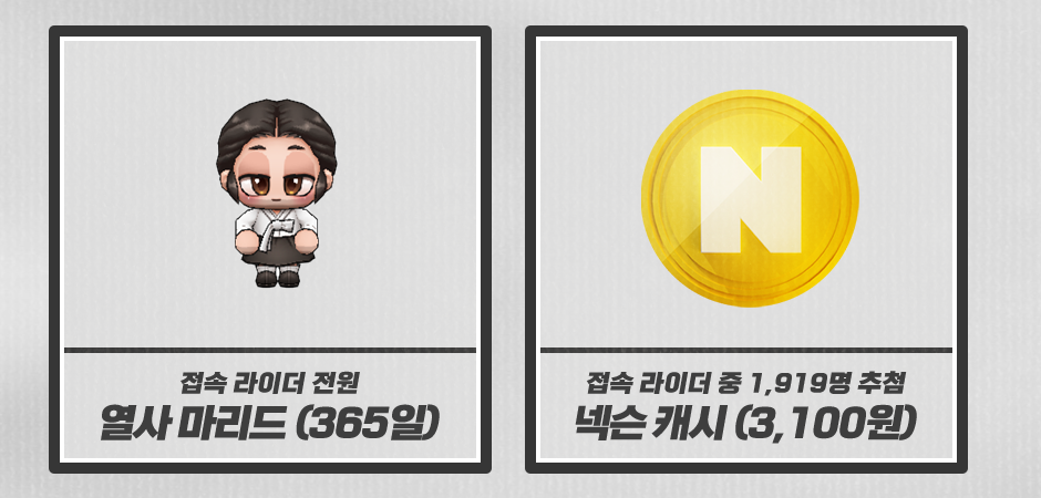 위 시간에 접속한 유저 중 1919명을 추첨하여 넥슨 캐시 3100원을 지급한다고합니다.