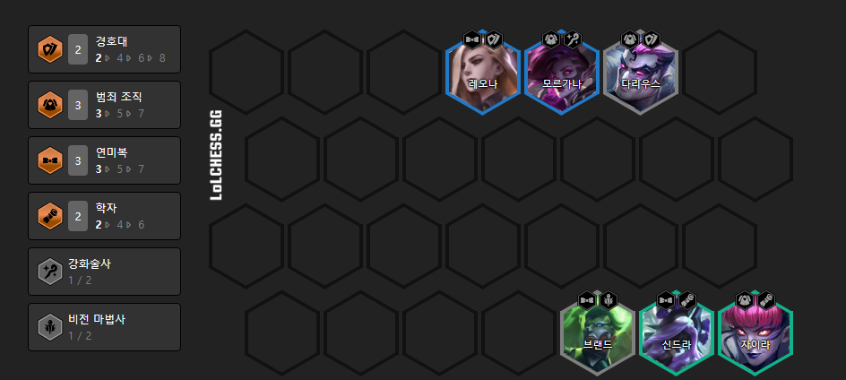 6레벨에 2 경호대, 3 범죄 조직, 3 연미복, 2 학자 시너지를 받으면서 위와 같이 덱을 맞춰주시면 됩니다.