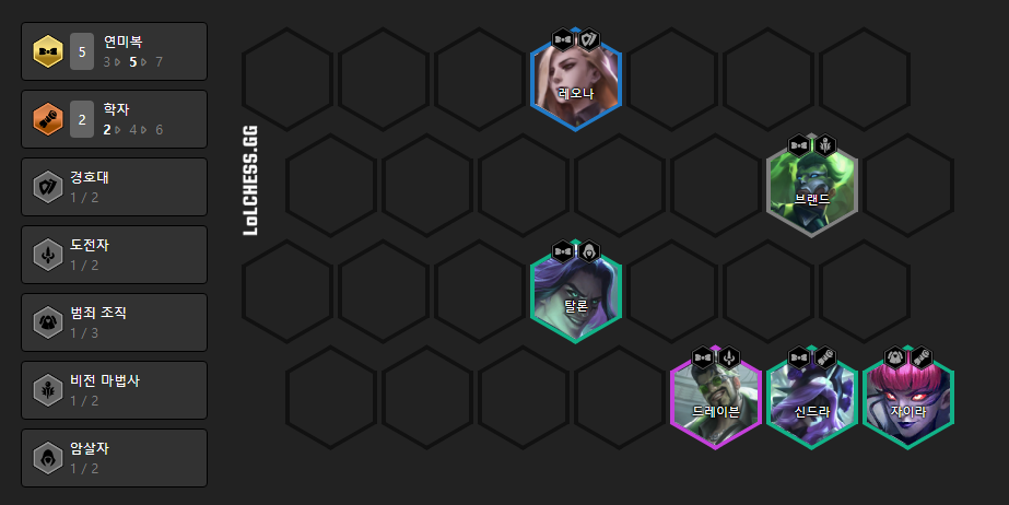 만약 초반이나 6레벨 전에 드레이븐이 나왔다면 위와 같이 5 연미복, 2 학자 시너지를 받으면서 덱을 맞춰주시면 됩니다.