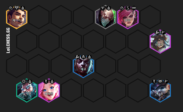 제이스가 없다면 질리언을 넣어서 사용하시면 되고 9레벨에 5혁신가 3사교계 시너지를 맞추시면됩니다.