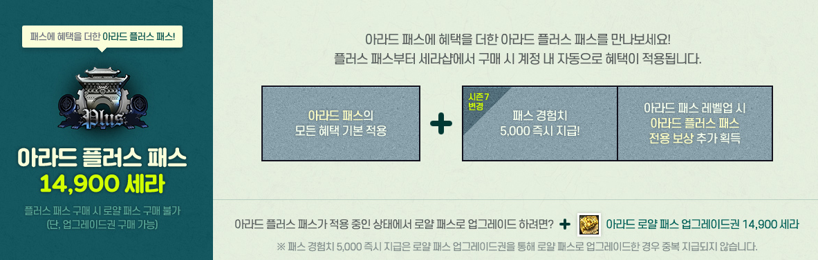 아라드 패스 기본 보상 + 패스 경험치 5000 + 아라드 플러스 패스 전용 보상을 추가로 획득합니다.