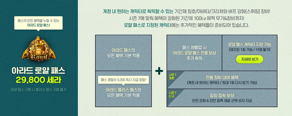 아라드 패스 기본 보상 + 아라드 플러스 패스의 모든 혜택 + 패스 레벨업 시 아라드 로얄 패스 전용 보상 + 로얄 패스 캐릭터 지정 가능 + 전용 장비 대여 + 일일 접속 보상 혜택을 받습니다.