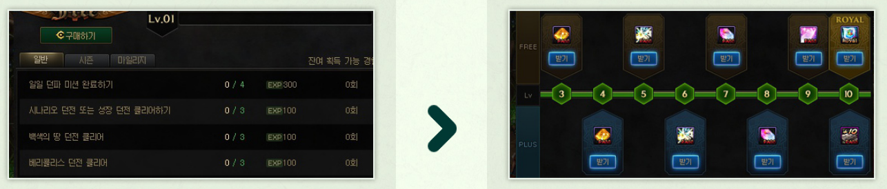 | 적정 레벨 던전 클리어 3회 | 퀘스트/미션 클리어 3회 |