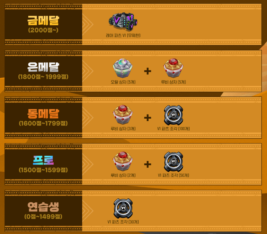 | 동메달 (1600~1799) | 루비 상자 (3개) + V1 파츠 조각 (100개) |