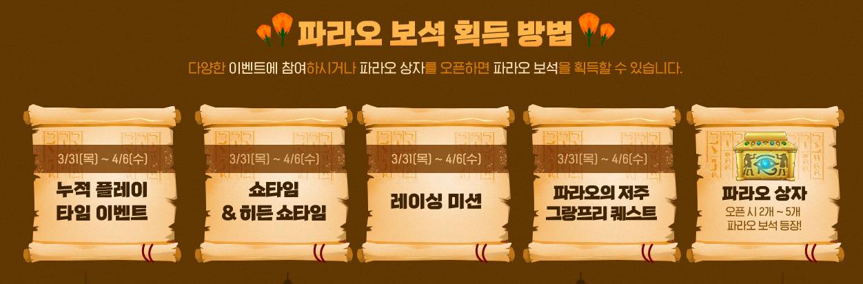 파라오 보석은 누적 플레이 타임 이벤트, 쇼타임&히든 쇼타임, 레이싱 미션, 파라오의 저주 그랑프리 퀘스트, 파라오 상자에서 획득할 수 있습니다.