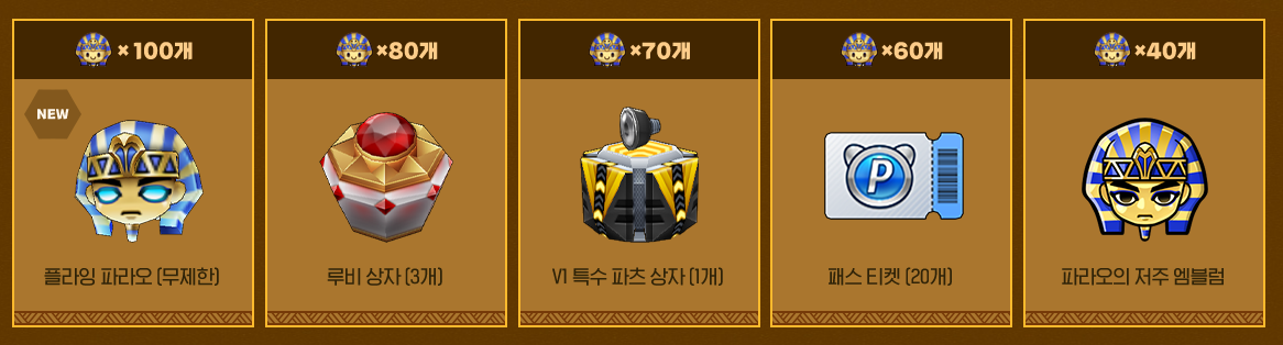 | 파라오 보석 | 100개 | 플라잉 파라오 (무제한) |