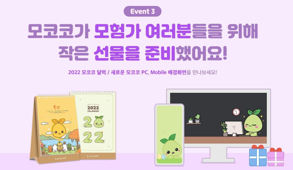 감사의 선물 보상은 헤드셋&마우스 세트 25명, 마우스&번지 세트 25명, 토토이끼 쿠션 50명, 모코코 텀블러 50명, 모코코 장패드 랜덤 100명, 모코코 2022 캘린더 100명, 로스트아크 장패드(랜덤) 100명