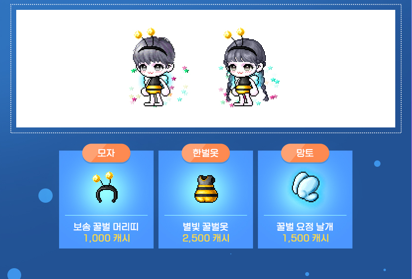 모자 : 보송 꿀벌 머리띠 / 한벌옷 : 별빛 꿀벌 옷 / 망토 : 꿀벌 요정 날개