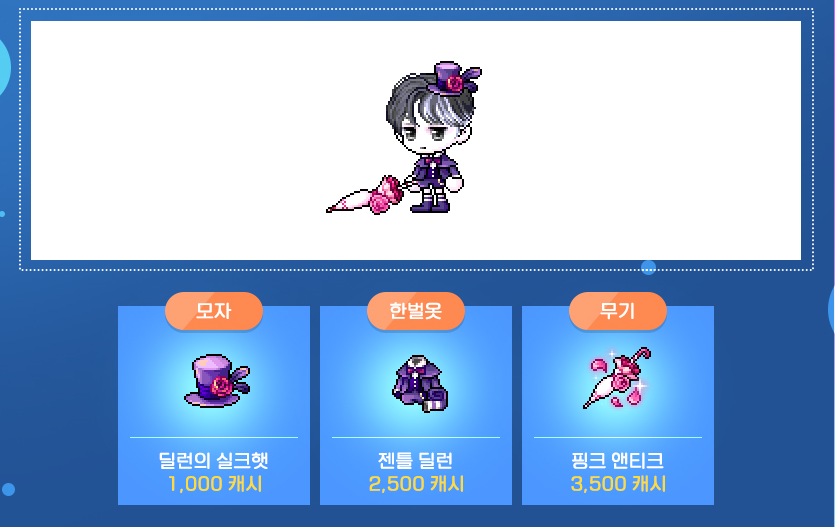 모자 : 딜런의 실크햇 / 한벌옷 : 젠틀 딜런 / 무기 : 핑크 앤티크