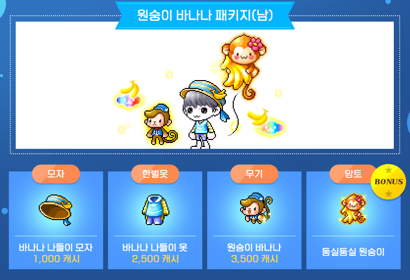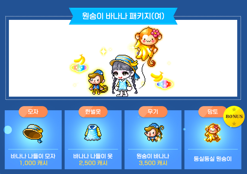 모자 : 바나나 나들이 모자 / 한벌옷 : 바나나 나들이 옷 / 무기 : 원숭이 바나나 / 망토 : 둥실둥실 원숭이