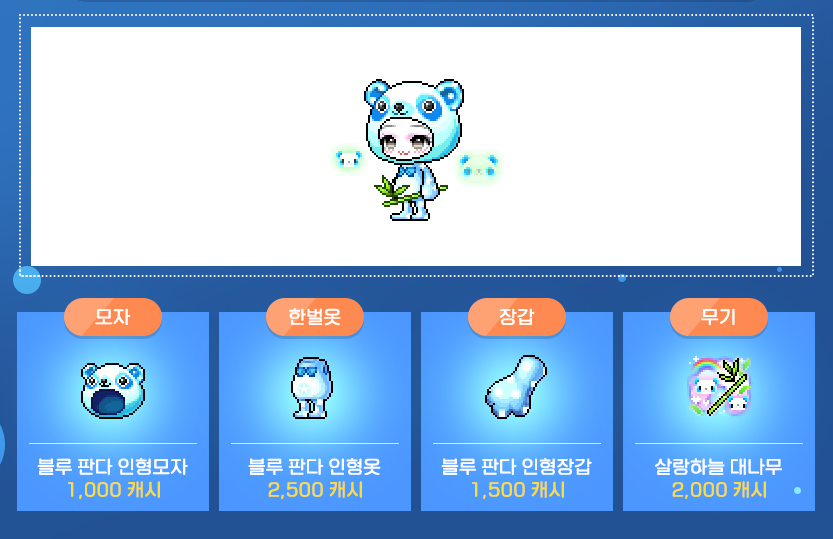 모자 : 블루 판다 인형모자 / 한벌옷 : 블루 판다 인형옷 / 장갑 : 블루 판다 인형장갑 / 무기 : 살랑하늘 대나무