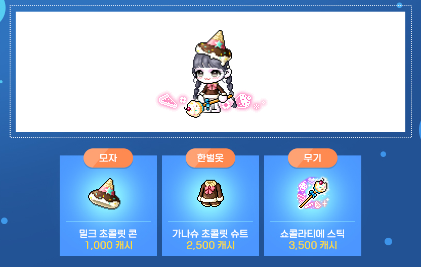 모자 : 밀크 초콜릿 콘 / 한벌옷 : 가나슈 초콜릿 슈트 / 무기 : 쇼콜라티에 스틱