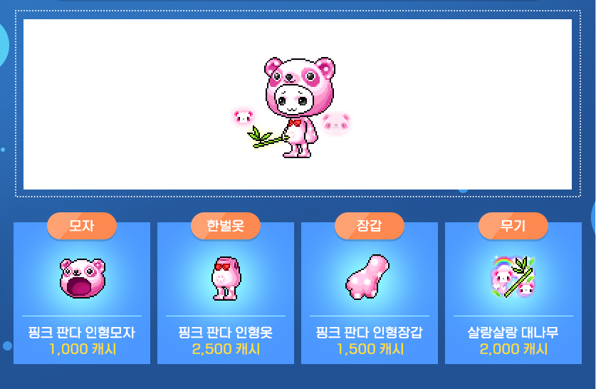 모자 : 핑크 판다 인형모자 / 한벌옷 : 핑크 판다 인형옷 / 장갑 : 핑크 판다 인형장갑 / 무기 : 살랑살랑 대나무